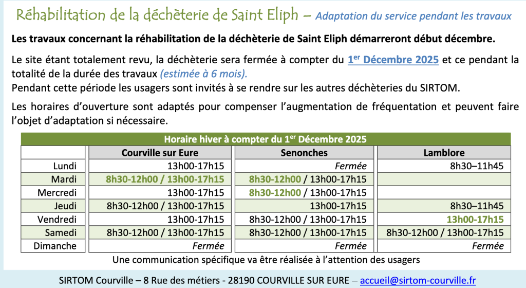 Passage aux horaires d’hiver À compter du samedi 1er novembre 2025, les trois déchetteries du SIRTOM repassent aux horaires d’hiver.